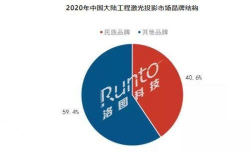 根據洛圖科技(RUNTO)發布的《2020年中國大陸激光投影市場分析季度報告》中顯示,2020年,工程激光投影市場中,民族品牌出貨量比重達40.6%。而通常的品牌格局是,民族品牌市占為25%左右,而日系品牌愛普生、索尼、NEC合并市占率能達50%以上。