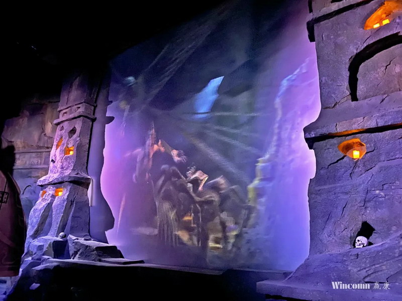 贏康為“勇闖盤絲洞”項目采用了40余臺科視激光投影機,其出色的色彩再現能力保證了各類投影載體上的畫面成像效果,穩(wěn)定的激光光源和持久耐用的特性也保證了樂園高度頻繁的使用需求;