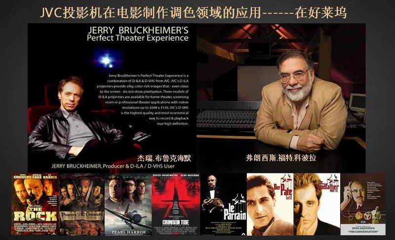 在好萊塢,使用JVC投影機進行畫質(zhì)校準的電影有:《碟中諜》系列、《加勒比海盜》系列、《教父》系列、《珍珠港》等眾多好萊塢經(jīng)典大片。