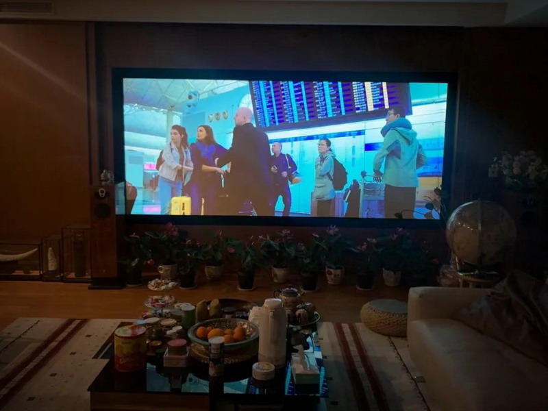 Crytal4-Sh白色款吊頂與客廳相得益彰,通過編程可一鍵實現16:9與2.35:1之間的切換,輕松投影140寸編織透聲幕。