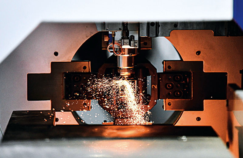 在第十七屆中國(guó)(天津)國(guó)際裝備制造業(yè)博覽會(huì)上,激光切割機(jī)進(jìn)行金屬切割作業(yè)演示(6月3日攝)   孫凡越攝/本刊
