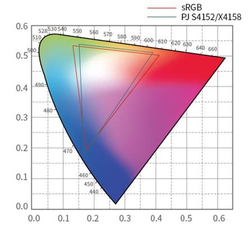 在投影機使用過程中,優質的畫面表現是必不可少的。本次理光商教投影機新品PJS4152/X4158導入全新艷麗色輪,使之擁有更廣闊的色域范圍,約占sRGB(Rec709)色域標準的90%,投影畫面顏色鮮艷,能夠真實還原色彩。此外,還采用了理光NCE自然色彩增強技術,在紅、綠、藍三原色外,加入黃、洋紅和青色,締造出自然真實的繽紛色彩和水晶般清晰透徹的高清影像。