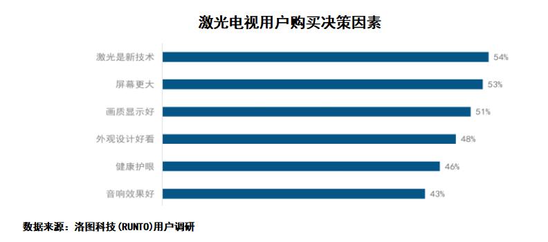 在影響激光電視購(gòu)買(mǎi)決策的影響因素中,技術(shù)是用戶看重的首要特征,占比達(dá)到54%。更好的產(chǎn)品體驗(yàn)和更高的顏值也是決定用戶購(gòu)買(mǎi)激光電視的主要訴求,屏幕更大(53%)、畫(huà)質(zhì)顯示好(51%)、外觀好看(48%)、健康護(hù)眼(46%)和音響效果好(43%)都占到一定比重。