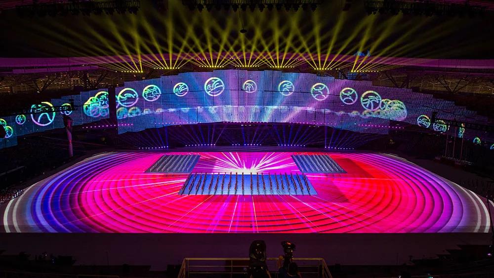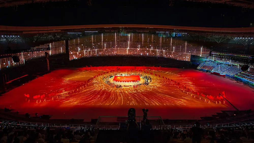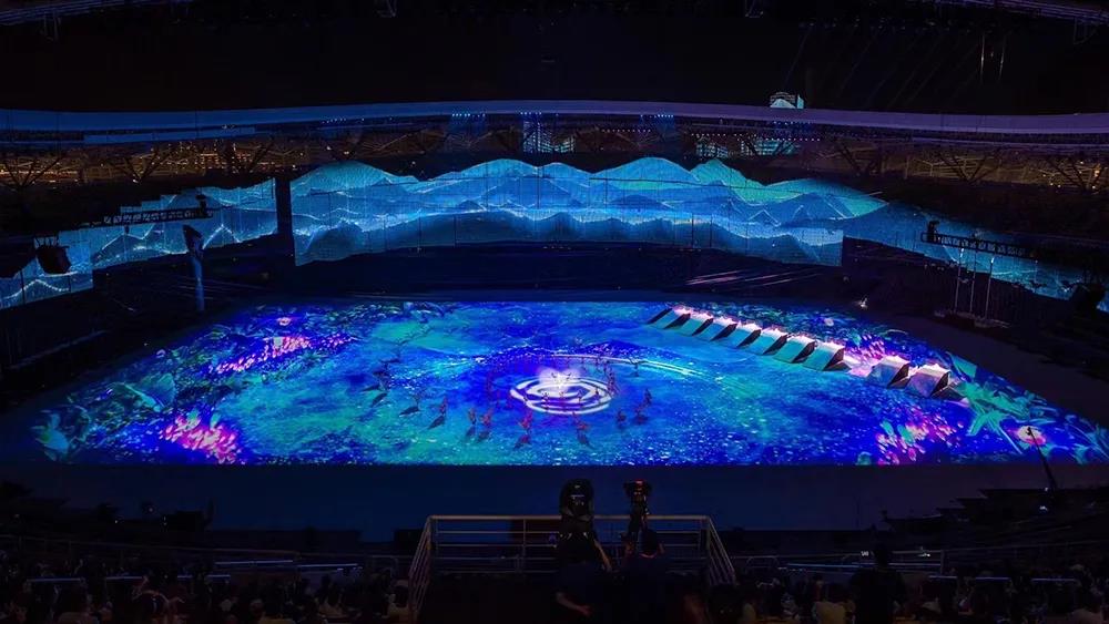 伴隨著第十四屆全運會會歌《追著未來出發》拉開了本次文體展演《奮斗新時代 奮進新征程》的序幕,13500平方米的巨幅畫面在奧體中心的地面上鋪開,漆黑的夜色將觀眾的視角團團包裹,地面則化身為巨大“熒幕”…… 據了解,此次開幕式的地面投影部分共使用了26臺51,000流明的松下紅藍雙色激光機PT-SRQ50KC以及50臺32,000流明的松下激光光源工程投影機PT-SRZ34KC,與演員舞者們相互配合,相輔相成,共同呈現出精美震撼的舞臺!