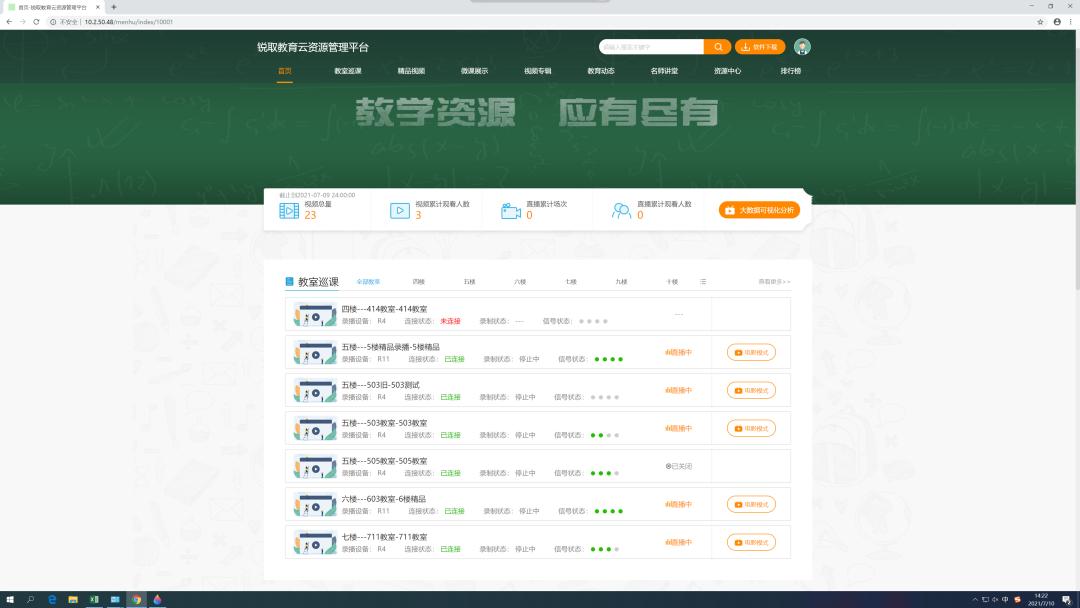 不僅于此,輕錄播教室結(jié)合云資源管理平臺(tái),可實(shí)現(xiàn)教室的在線巡課和后臺(tái)管控,信息中心的老師們?cè)谄脚_(tái)即可對(duì)教室錄播設(shè)備進(jìn)行遠(yuǎn)程開關(guān)機(jī)和課程錄制安排,銳取先進(jìn)的智慧科技讓教室的統(tǒng)籌管理不再繁瑣。