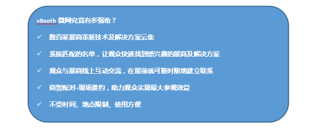 vBooth微網(wǎng),這是展會網(wǎng)站上提供給所有展商的專用頁面,將以圖片、文字、視頻等形式,讓觀眾全方位、直接地預(yù)覽到數(shù)百家展商的革新技術(shù)及解決方案。