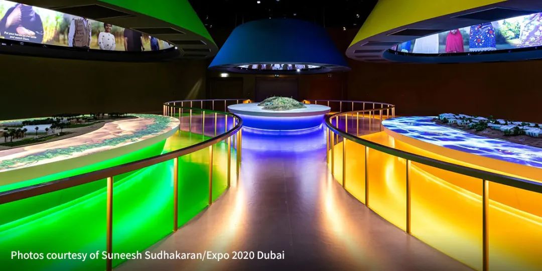 參觀者選擇路徑進入到不同的展廳——在水資源主題廳,來自秘魯山區(qū)的阿貝爾通過視頻展現(xiàn)了自己收集霧氣并將其轉(zhuǎn)化為水來解決當?shù)厮Y源短缺問題;在食物和能源主題展廳,來自阿聯(lián)酋和坦桑尼亞的婦女分別展示了自己推廣可持續(xù)有機農(nóng)業(yè)發(fā)展和利用太陽能電池板創(chuàng)造可持續(xù)能源的行動。