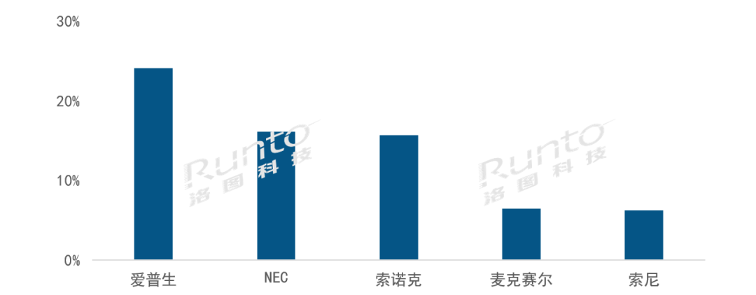 2021年商務激光投影出貨量為4.4萬臺,同比增長43.9%。在商務市場中,光源轉向激光正在成為高端需求中的風向,眾多品牌選擇在該市場發力。愛普生在商務市場不僅推出了CB-L200X/W/F系列,填補了4000-5000流明商務長焦激光投影的空白,更是推出全球最小3LCD激光投影EF-11,一系列動作使愛普生市場份額達到24%,市占第一。其次是NEC排名第二,NEC投影機著眼3500-6000流明段的行業場景需求,主推李白、騎士、空靈三大系列,實現商用、教育、沉浸式等領域的全面覆蓋,市場份額達到16%。索諾克推出長江系列激光商務投影機共11款產品,亮度覆蓋3200-3600流明段,能夠滿足各類中小場景的應用,市占達到15.7%。