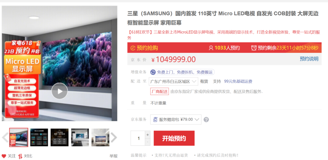 5月24日,三星110英寸Micro LED電視正式登錄京東平臺開啟預售,價格為1049999元。