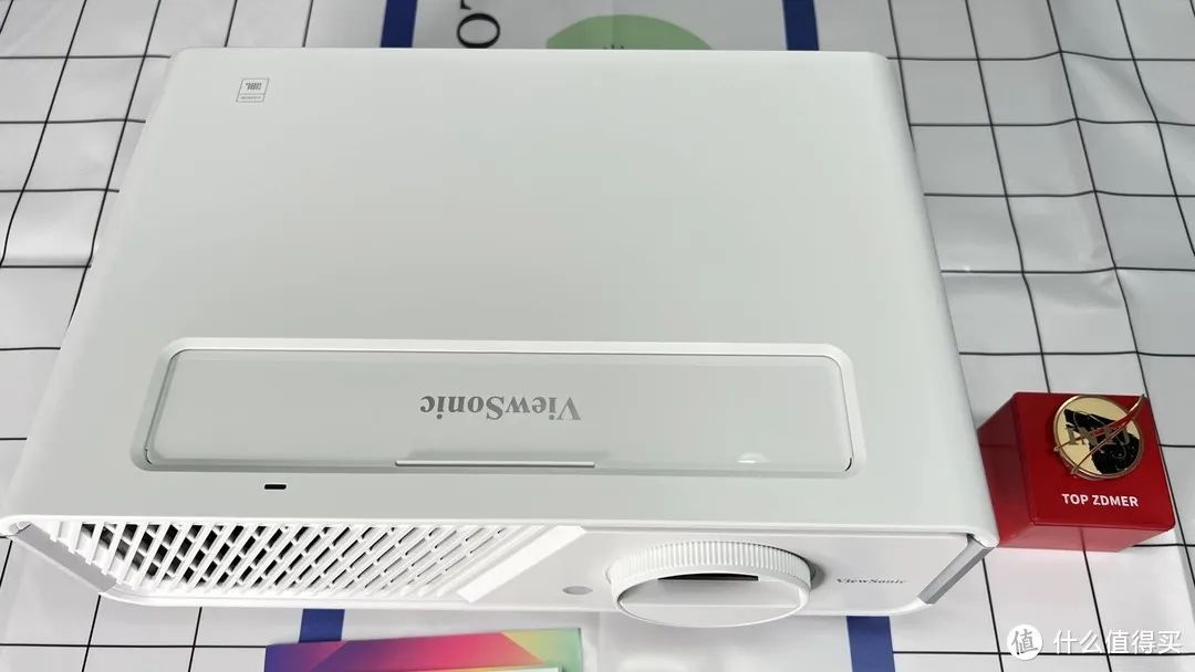 然后這里的按鈕上做了一個蓋子,平常的時候關起來,能讓機器和鏡頭位置更好的防塵。機器外觀上倒是優派老傳統,白色塑料外殼,不過這塑料的質感并不差,他們家真的是把錢都花在刀刃上,盡量的提升畫質,本機采用RGBG LED光源技術,提供2300 ANSI 亮度和 125% Rec 709色域范圍。而且LED投影開機短時間即可達到峰值亮度,關機也無需漫長的散熱等待。