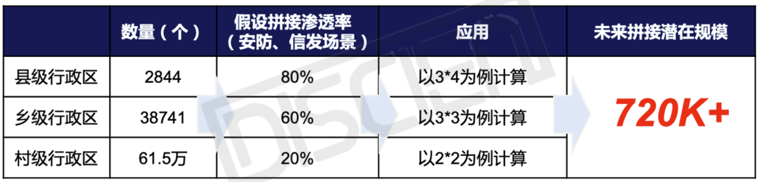 根據國家民政部數據顯示,全國共計超2800個縣、約3.9萬個鄉(鎮)、超60萬個村莊,整體呈金字塔形分布;區級以上行政區域建設較早,尤其是安防市場,建設相對飽和,下沉市場將成為液晶拼接新的增量市場。同時隨著液晶拼接價格的持續下移,下沉市場應用將保持增長之勢。從需求特點來看,縣級行政區液晶拼接應用多以3*4為主,鄉(鎮)村級多以3*3、2*2為主,按此應用推算,預計未來可帶來液晶拼接市場需求超700K,潛在需求空間可觀。