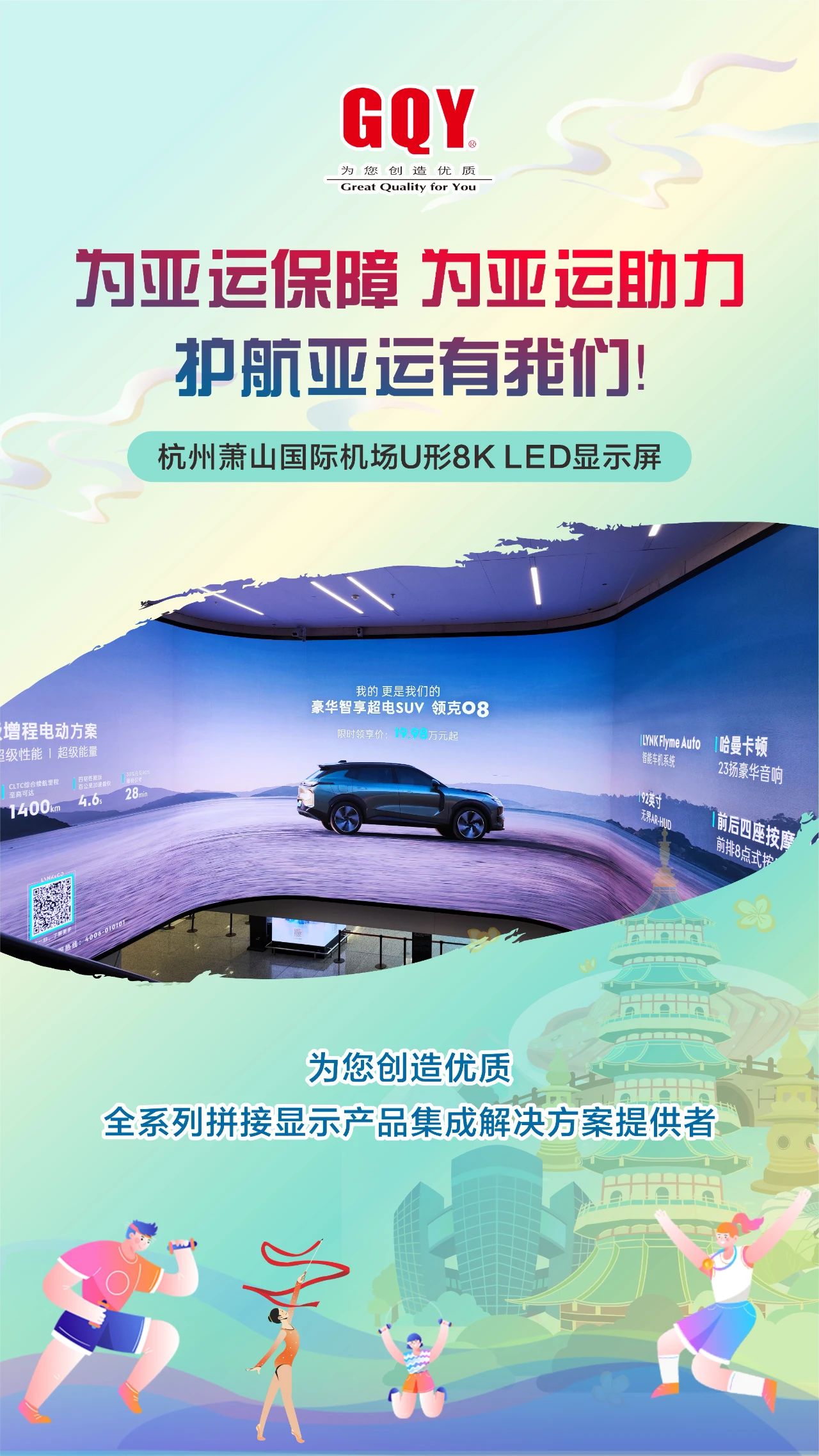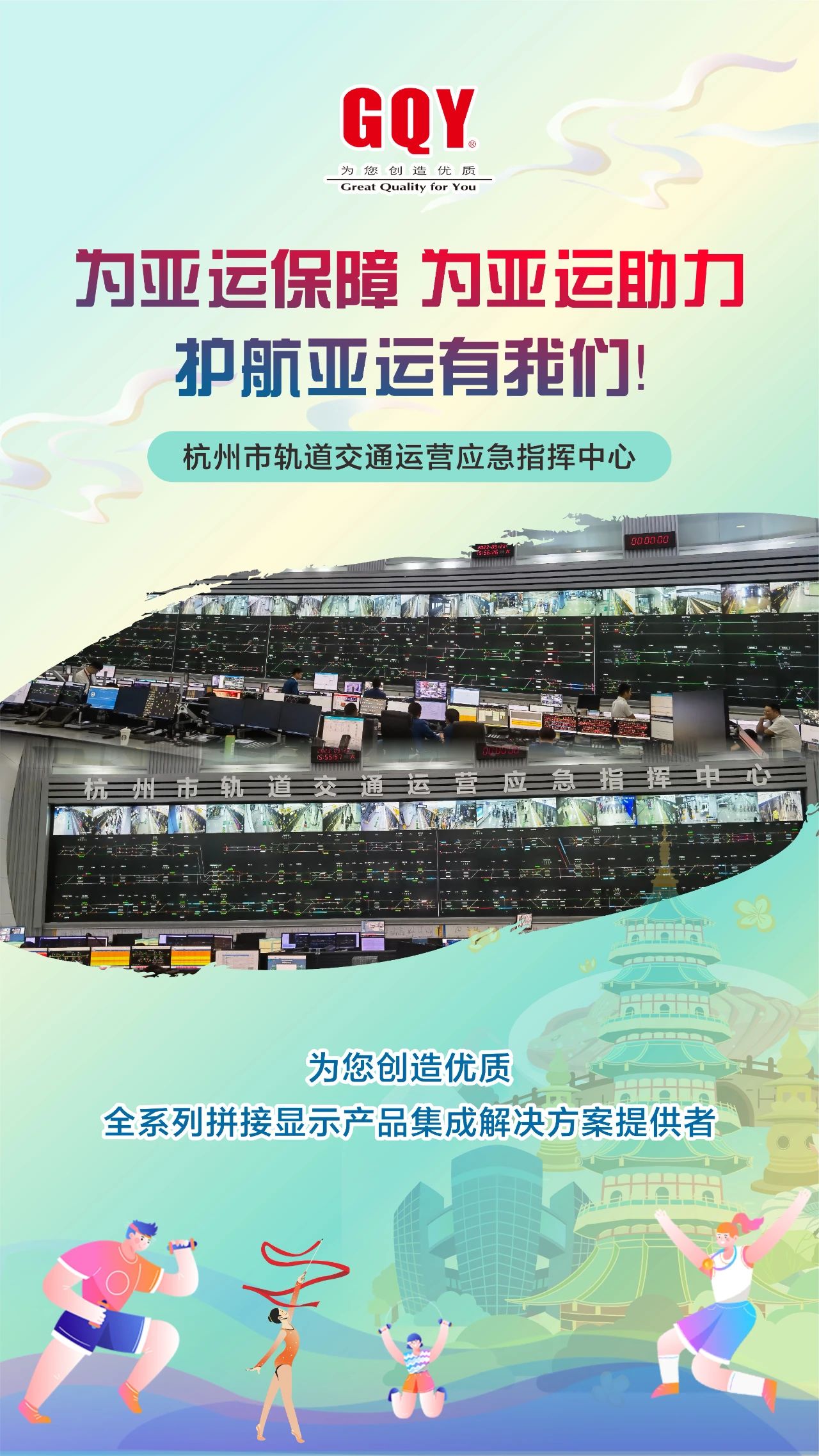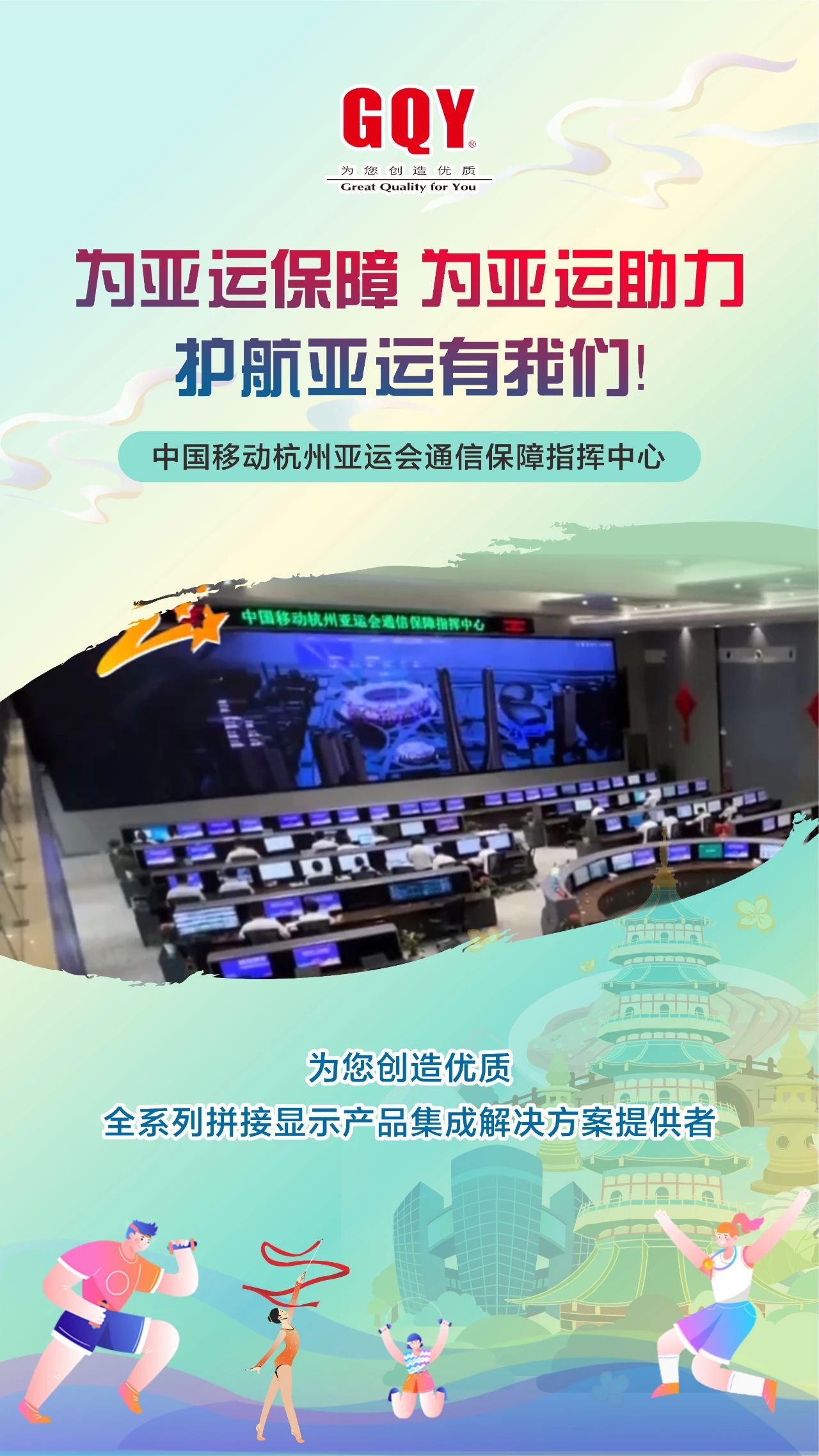 潮涌迎盛會,金秋共亞運。象征著亞洲大團結的體育之火在西子湖畔、東海之濱舞動燃起,2023年9月23日,一場萬眾矚目的體育盛會,一場炫目璀璨的文化盛宴在杭州激情開幕。精彩舞臺搭就,八方賓客抵達,杭州,這座千年文化名城在數智化力量的加持下,正以嶄新的面貌迎接全球賓客。機場站樓、軌道地鐵、西子湖邊、錢塘江畔、大運河旁、街頭巷尾接待了數以萬計來自亞洲各地的賓朋、運動員、觀眾和游客。作為一家曾為杭州軌道交通、移動通訊、消防安保、城市商顯等各行各業深度賦能、提供過專業高清大屏顯示解決方案的視訊企業,GQY視訊護航助力亞運會,在亞運會召開期間全力做好后方保障工作。