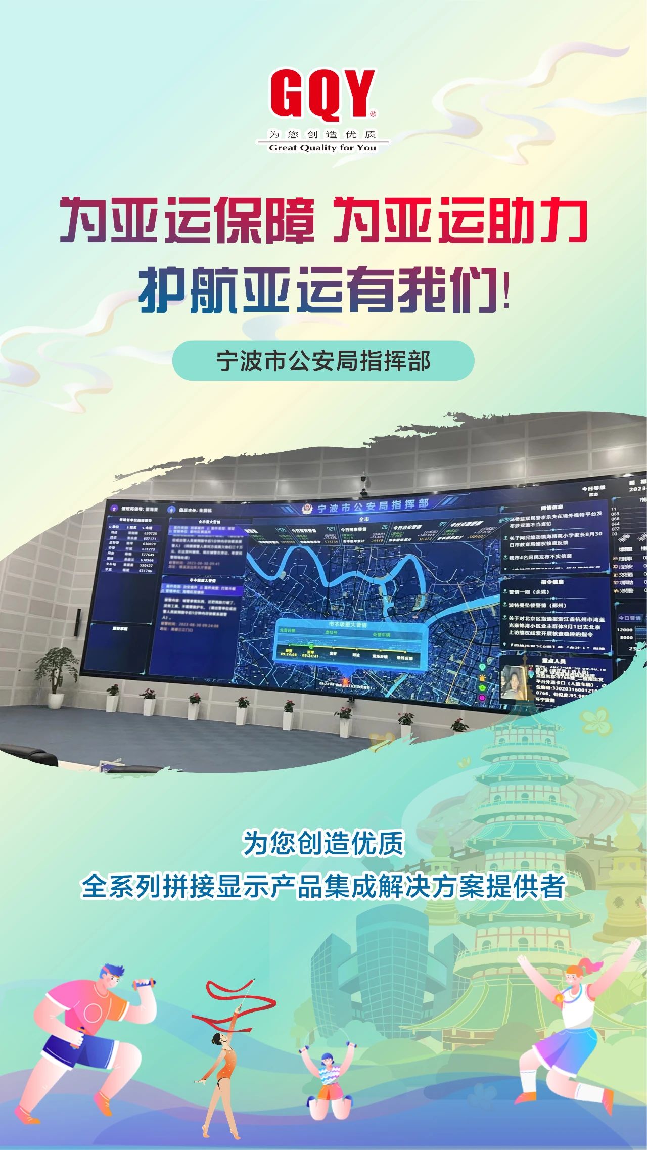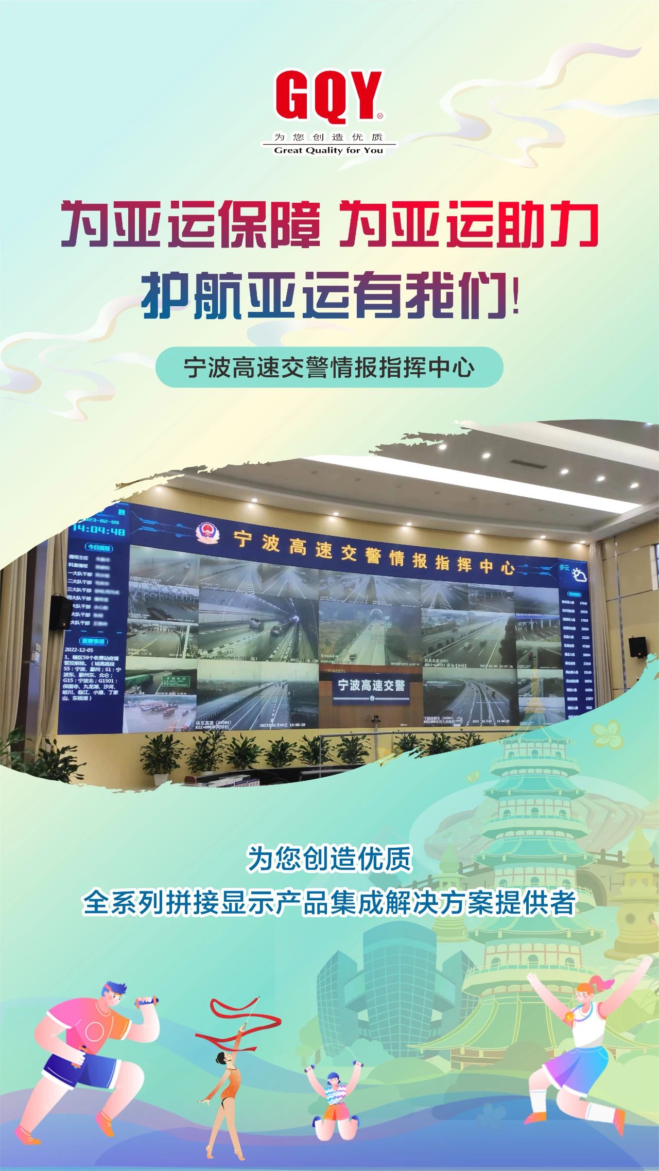 寧波作為本屆杭州亞運會協辦城市之一,承辦了多個亞運會比賽項目,這座文明、開放、充滿活力的城市同樣敞開懷抱共建共享亞運的光榮與夢想。亞運會期間,提供安全、便捷、高效的安全保障工作將是重中之重,GQY視訊為機場通行、地鐵運營、高速交通、公安交警、市民熱線打造的高清大屏,多點聯動,一體推進,為亞運助力守護,高質量、高標準、高要求的做好統籌運行工作,用實際行動展示“潮涌文明之海,共揚亞運之帆”的濱海寧波文明氣度,與杭州共奏“愛達未來”的和諧樂章。