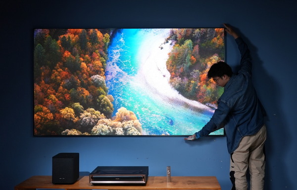 海信激光電視L8K屏幕薄至15mm,重量僅為同尺寸液晶電視的1/4,且因屏幕不通電,不用擔心散熱問題,可無縫貼墻安裝,輕松融入各種裝修風格。同時,它擁有動態(tài)背景、多樣時鐘、律動音樂、藝術(shù)畫廊等附加功能,輕松變身客廳藝術(shù)品。