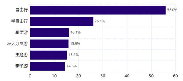 在出游方式上,56%的Z世代都選擇了自由行,遠高于跟團游或各種主題游,他們自己完成交通、酒店和門票的預定,想去哪兒去哪兒,偏愛自由的特征十分明顯。
