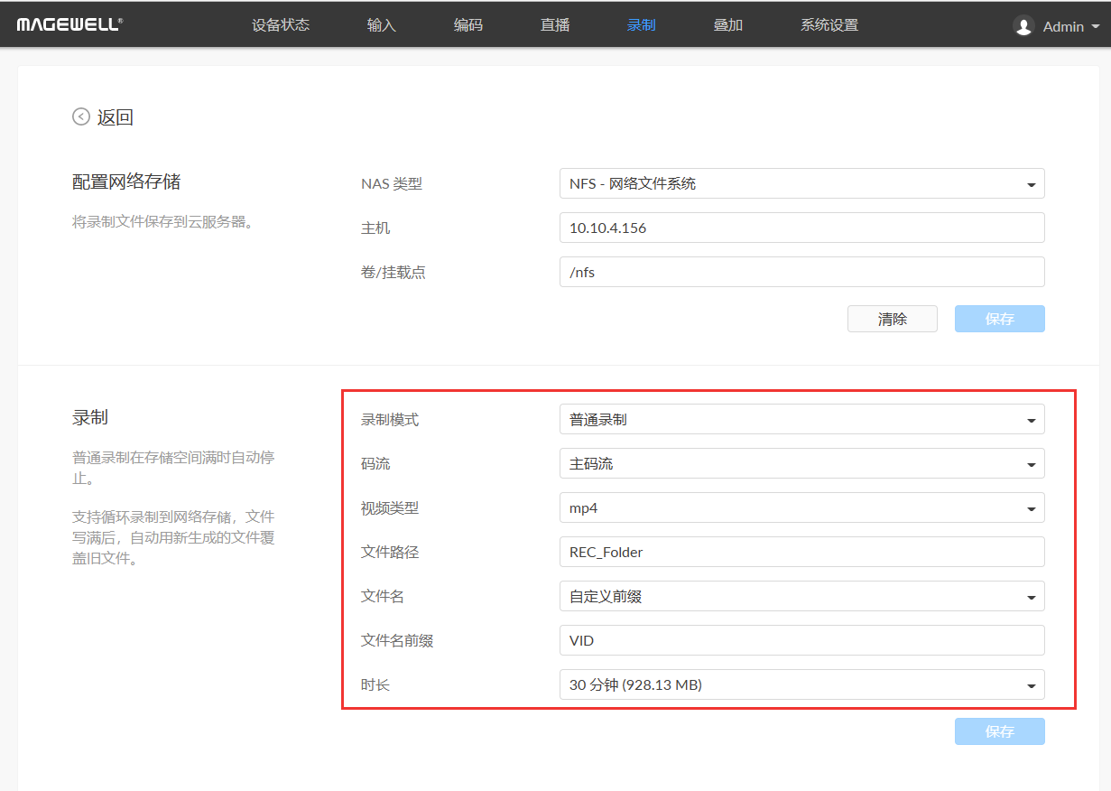 2、在彈出的頁(yè)面中,配置錄制參數(shù):“NAS類型” 支持CIFS-通用互聯(lián)網(wǎng)文件系統(tǒng)(默認(rèn))和NFS-網(wǎng)絡(luò)文件系統(tǒng),本文以NFS為例。“主機(jī)” 輸入NAS的主機(jī)IP地址,如下圖的“10.10.4.156”!熬/掛載點(diǎn)” 即mount-point,指定目的存儲(chǔ)盤(pán)名稱,如下圖的“/nfs”,設(shè)置后點(diǎn)擊“保存”。