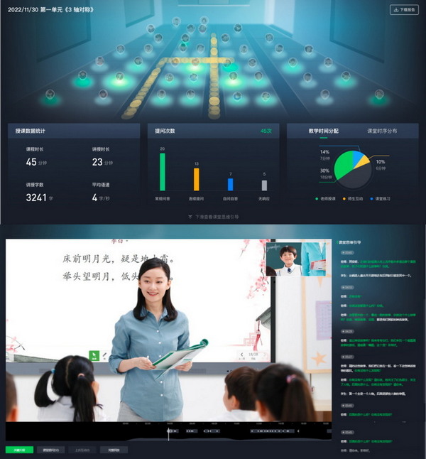 AI課堂智能分析系統(tǒng)以“老師全景”+“學生全景”畫面為基礎(chǔ),系統(tǒng)會對課堂互動、教學語言和行為、學生表現(xiàn)等多個維度進行歸納分析,并沉淀出教學數(shù)據(jù)——比如提問引導、鼓勵互動、老師講解等不同環(huán)節(jié)的出現(xiàn)頻次、持續(xù)時長、課程占比等,最終生成一系列客觀的課堂質(zhì)量報告,助力教學設計的優(yōu)化和提升。