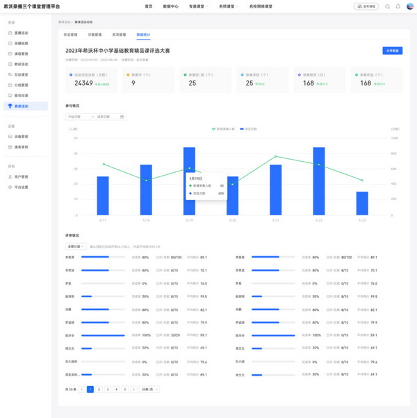 從創(chuàng)建比賽、選手報名、作品收集,到評委評分、結(jié)果公布,比賽的全進程都可靈活掌控、高效推進。足不出戶隨時看課評課,評分數(shù)據(jù)自動統(tǒng)計匯總,評審進度和結(jié)果全程可追溯 ,獲獎作品還可常態(tài)化供區(qū)域教師觀摩學習。發(fā)掘潛力教師,沉淀優(yōu)質(zhì)資源——“千里馬”和“伯樂”都不該難尋覓、難挖掘。