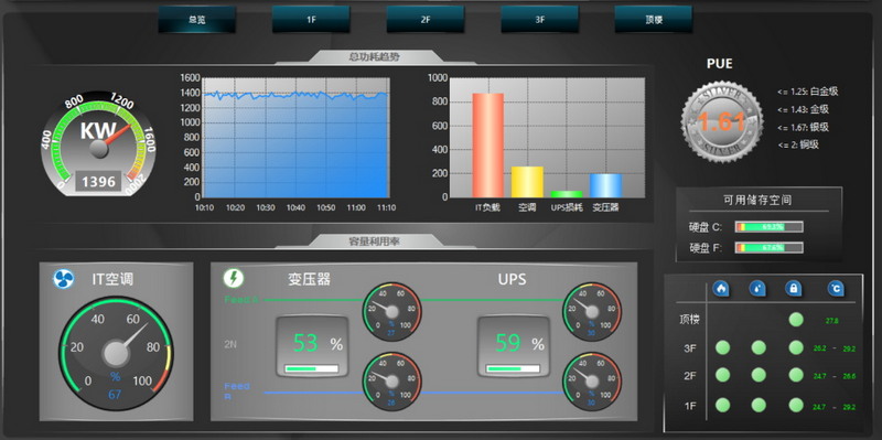 通過一系列的節能措施,讓數據中心PUE低于1.3。如,通過氣流抑制系統隔離冷熱空氣,采用水平側送風減少阻抗;采用低載高效UPS,半載效率高達94%以上等。