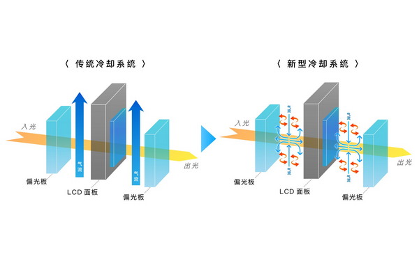 再例如,RU330、RU336ST產品在光閥散熱上不是簡單的“單側進風”冷卻,而是通過大功率渦輪風扇驅動進風,并讓進風在上蓋反射形成兩股對沖氣流,兩股氣流相互擠壓在液晶板中部位置形成螺旋狀氣旋,可以更為均勻地對液晶板和偏光板進行散熱,快速抽離熱量。此設計能夠延長液晶板和偏光板使用壽命,提升全壽命性能可持續性,并保持更低的散熱噪音。