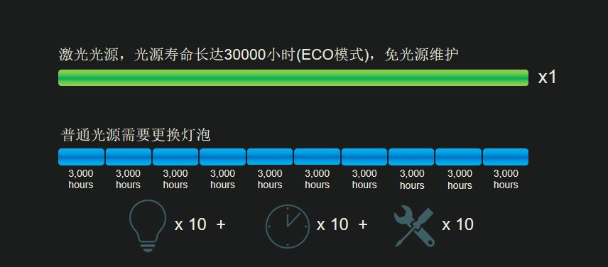 激光光源穩定持久,是一般投影機燈泡壽命的6~10倍,基本不需要更換光源,因此可以安心使用。