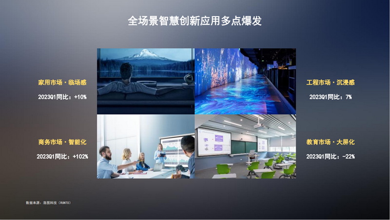 激光顯示的創新應用多點頻發。根據洛圖科技(RUNTO)數據,2023年第一季度,家用場景增長10%,中長焦和超短焦技術并駕齊驅,4K+三色成為產品新趨勢;商務市場大漲102%,普及型、便攜型、智能化產品拓展了使用場景;教育場景下信息化設備滲透率接近飽和,市場規模下跌22%;工程場景增長7%,高端萬流明級別亮度和高性價比輕量化產品并行。