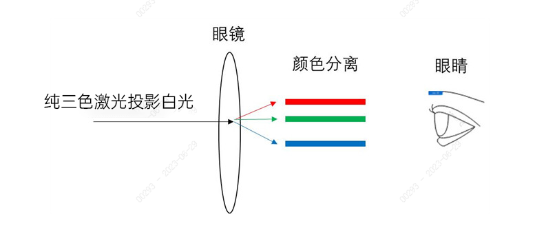 彩邊不同于投影光學系統的橫向色差(Lateral Chromatic Aberration)導致的色散現象,它無法通過鏡頭的消色差來解決,觀看角度和距離不同、人眼屈光度散光度不同人眼處觀察到的彩邊程度也不同,僅能通過使用寬光譜光源改善彩邊。