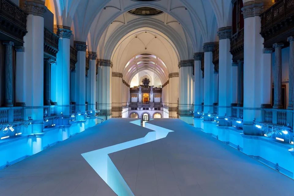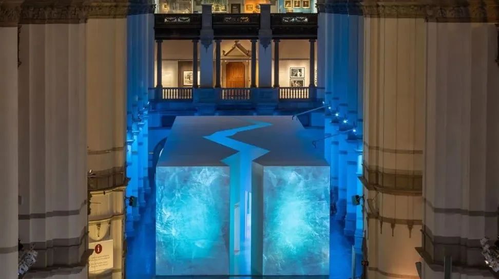 瑞典北歐博物館(Nordiska Museet)通過(guò)展覽“北極——當(dāng)冰在融化時(shí)”(TheArctic: WhiletheIceis Melting)展示了北極地區(qū)的生活和不斷變化的環(huán)境。展覽入口的數(shù)字屏模擬冰雪效果呈現(xiàn)巨型冰塊影像。高大的數(shù)字化冰山融水影像被裂縫一分為二,形成的入口正好引導(dǎo)觀眾進(jìn)入“極地世界”。影像的冷色調(diào)降低了觀眾的視覺(jué)溫度,第一時(shí)間激發(fā)出觀眾對(duì)北極寒冷的直接感知。館方利用數(shù)字技術(shù)使觀眾沉浸于真實(shí)環(huán)境與虛擬場(chǎng)景共同營(yíng)造的極地氛圍中,通過(guò)多感官喚起身體本能的情感。