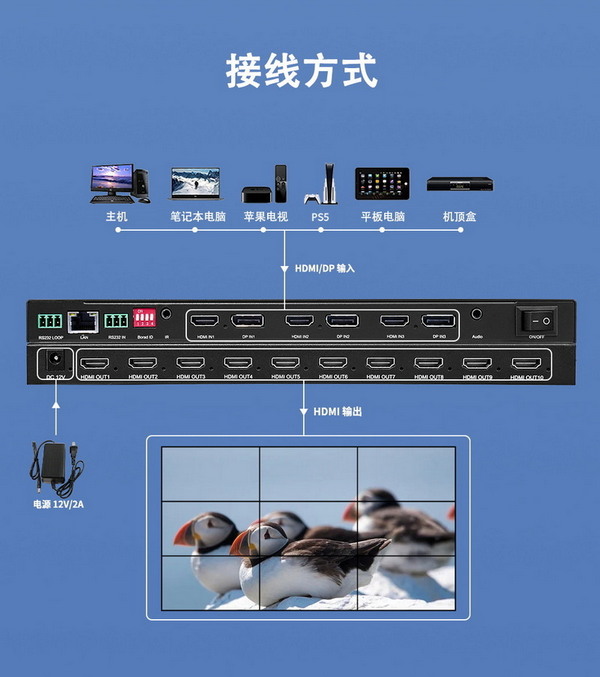 比特視訊新一代多屏寶,采用3通道輸入、10通道輸出設計,單臺設備實現2x5拼接,更低的成本,解決奇數列拼接需多臺設備實現的煩惱;還支持1x9、1x10、3x3等18種模式,并且能大規模并聯使用。這是技術的突破,是視覺的革新,讓你在享受多屏的便利同時,也能感受到超高分辨率帶來的細膩畫質。
