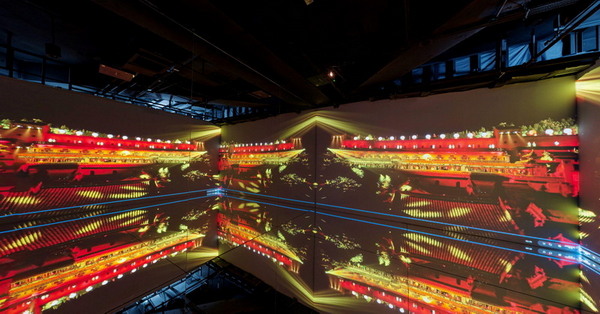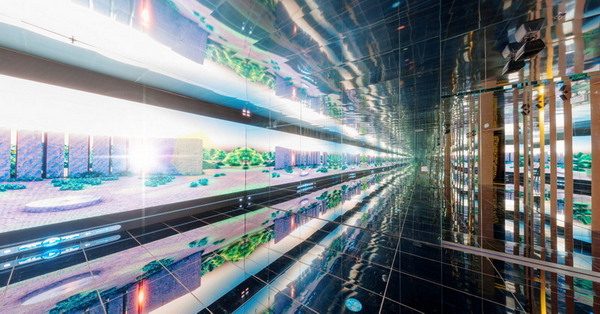 山西好風(fēng)光沉浸式展區(qū)采用720°鏡像長(zhǎng)廊,參觀者步入長(zhǎng)廊空間,鏡面縱深感使觀眾如同懸空跨過(guò)山西每一寸土地。