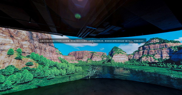 大美大行展區(qū)采用超長(zhǎng)拼投展示山谷陡峭、關(guān)口聳立的太行山景色,以影像重走掛壁公路。參觀者站在屏幕面前的動(dòng)感飛船平臺(tái)上,仿佛置身其中。
