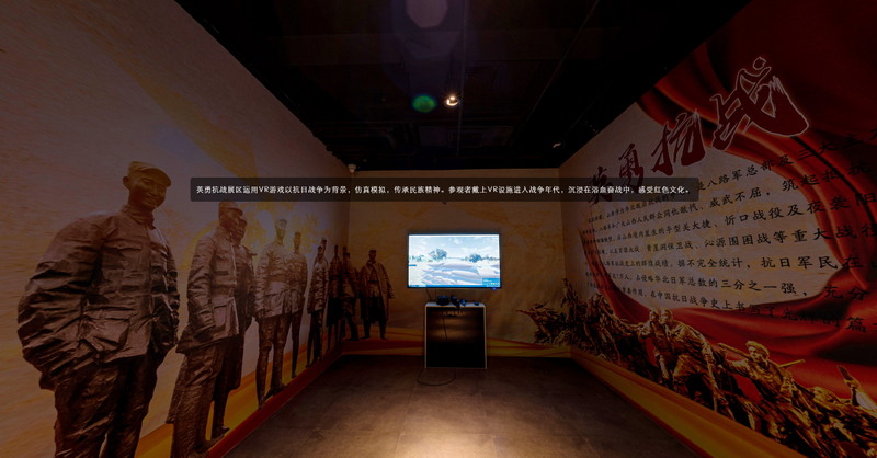 英勇抗戰(zhàn)展區(qū)運(yùn)用VR游戲以抗日戰(zhàn)爭(zhēng)為背景,仿真模擬,傳承民族精神。參觀者戴上VR設(shè)施進(jìn)入戰(zhàn)爭(zhēng)年代,沉浸在浴血奮戰(zhàn)中,感受紅色文化。