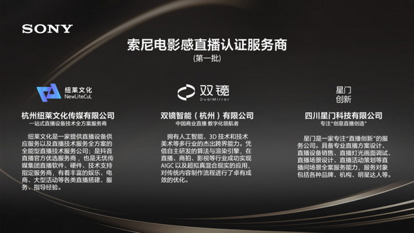 同時,在本次交流會索尼還公布了索尼電影感直播服務商認證項目。基于專業直播技術團隊能力和展示空間要求,三家服務商:杭州紐萊文化傳媒有限公司,雙鏡智能(杭州)有限公司和四川星門科技有限公司成為首批索尼電影感直播認證服務商。