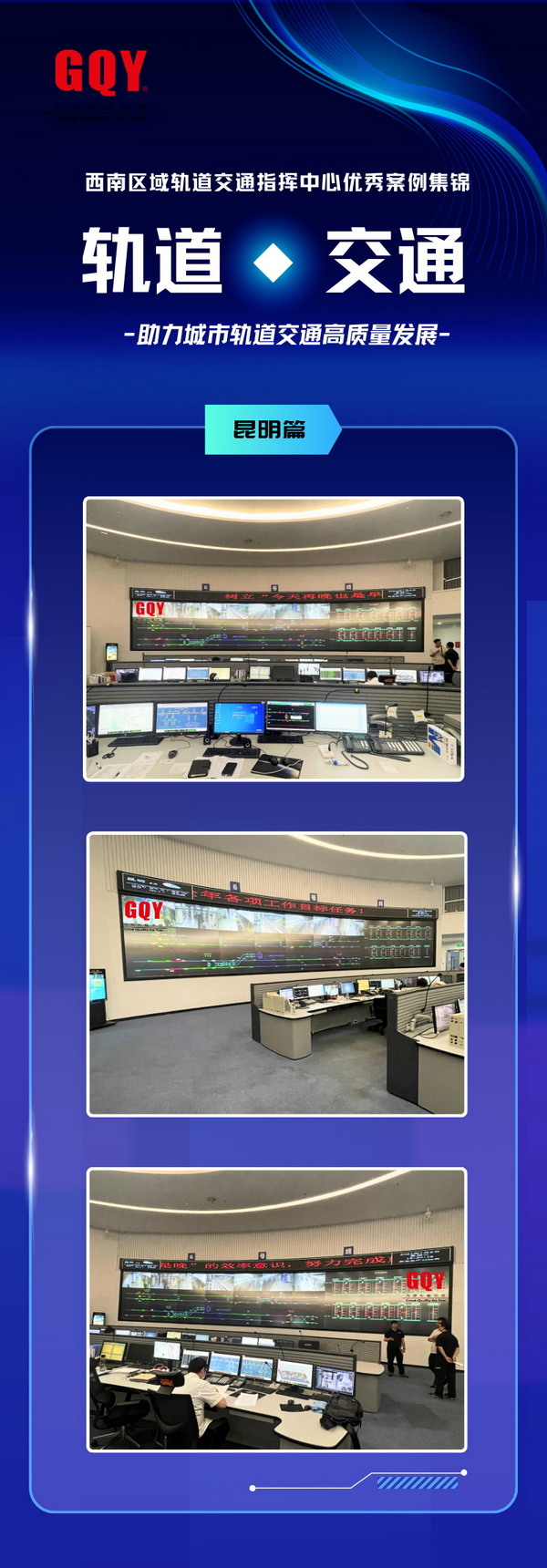 GQY視訊在西南軌道交通的工程項目輻射范圍之廣,不僅涵蓋了重慶市軌道交通綜合運營協調指揮中心、重慶市軌道交通18號線指揮中心、重慶市郊壁山至銅梁(壁銅線)指揮中心、成都市IT大道有軌電車指揮中心、成都市軌道交通2號線指揮中心、4號線指揮中心、8號線指揮中心及成都市軌道交通10號線/13號線綜合監控指揮中心等重要線路,而且也為“春城”昆明市軌道地鐵/有軌電車交通6號線指揮中心、“綠城”南寧市軌道交通2號線及3號線指揮中心和“城市氧吧”貴陽市軌道交通1號線指揮中心等,提供了可視化大屏系統集成解決方案。