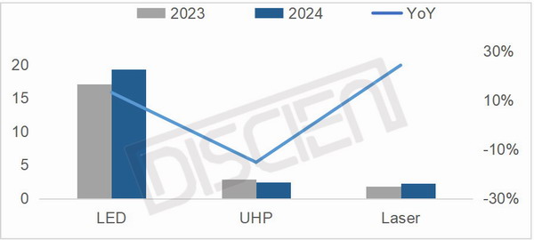 2024年全球投影出貨在夏季賽事效應、中國國補政策、以及年底北美搶出貨效應的拉動下延續了增長勢頭。據DISCIEN(迪顯)統計數據,2024全球投影出貨量24M,同比增長10%。其中,Q4 出貨同比顯著高于往年同期,增幅達 20%。主要源自特朗普 11月當選總統,市場基于貿易戰卷土重來的提前應對,又考慮到年初的春節影響出口效率,在年底出現了“搶出口”的現象。