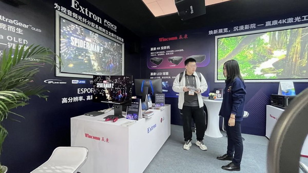 Extron品牌展區同樣聚滿了好奇的參觀者,贏康在展位搭建了真實的電競場景,Extron FOX3 光纖系統搭配了LG UltraGear OLED電競顯示器,以及贏康4K投影機C-4K900,訪客可以現場暢玩120幀高刷游戲,感受絲滑極致體驗。