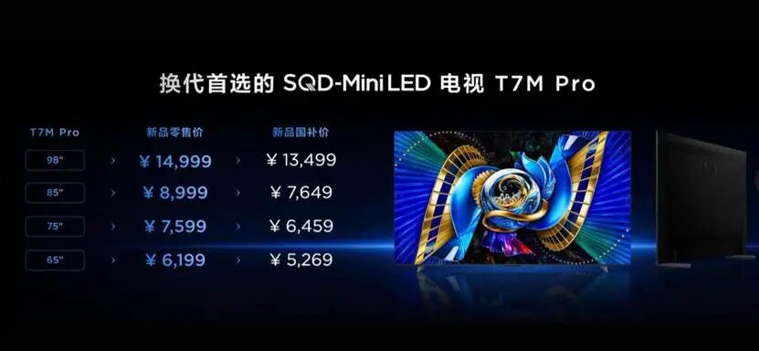 三款新品完整覆蓋了五千至一萬出頭的主流價位段,把機皇同款的 100% BT.2020 全局高色域、萬象分區控光、超級量子點等核心技術,毫無保留地下放。其中定位換代首選的 T7M Pro,65 英寸版本國補后僅5269 元,真正把 SQD-Mini LED 電視打入了5000 元主流價位,要知道,兩年前這個價位只能買到最普通的 LED 電視。即便是定位輕旗艦的 Q9M Pro,75 英寸版本國補后也僅 8269 元,讓萬元內市場也能享受到旗艦級的畫質體驗。