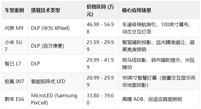 然而,中國市場正在打破這一僵局。問界 M9 搭載了華為自研的 XPixel 像素車燈技術(shù),其核心依然基于 DLP 投影原理,實現(xiàn)了包括變道指引、窄道光毯、車道路徑投射等功能 。小米 SU7 則更進(jìn)一步,在不到 30 萬的價位段引入了百萬像素智慧投影大燈,不僅支持高級智駕輔助,還能實現(xiàn) 100 英寸以上的巨幕投影,極大提升了車輛的性價比標(biāo)簽 。這些案例表明,通過本土產(chǎn)業(yè)鏈的規(guī)模化效應(yīng)與算法優(yōu)化,DLP 技術(shù)的門檻正在被顯著拉低,但其作為“高像素”代名詞的地位依然穩(wěn)固。