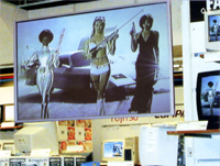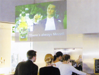 該屏幕可以掛在半空中,而配置的投影機則可安置在天花板上或地面上.這樣,在廣告信息很容易吸引眾人的注意力的地方,你可以充分而自由地選擇安裝地點.如:在商店的櫥窗里,在柜臺的上方,在商店的走廊上,在乘電梯的地方和在咖啡廳里.