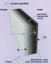 該屏幕包括兩種不同類型的屏幕:一種是透明幕,具有平的表面和特殊的"透視效果",另一種是對比幕具有先進的嵌入透鏡和棱鏡子結(jié)構(gòu).同時它也包含了特殊的可以吸收周圍光線使對比度增加的濾波器.