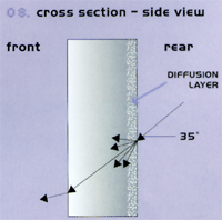 背投圖像是由屏幕后側(cè)的一層薄薄的傳播層產(chǎn)生的.并且通過半透明的亞克力物質(zhì)向前傳播.而屏幕前側(cè)折射觀眾方向的光線,該幕的最佳投射角度為20到35.