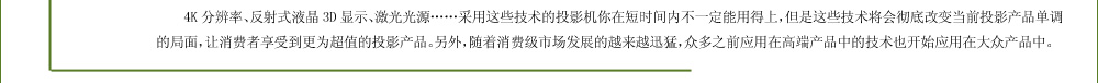 | 這款新品是全球首款家用投影機(jī)達(dá)到目前數(shù)字影院級(jí)別的4K(4096×2160)分辨率,令人震撼。其采用的是索尼獨(dú)家的SXRD技術(shù),配備4K