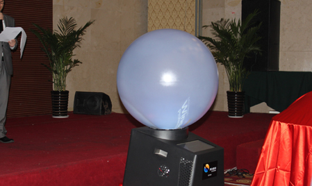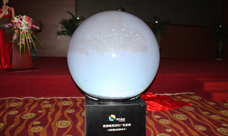 進入會議高潮部分,由羿飛陳總和宜興經濟開發區朱曉燁書記共同揭下第一款新品的面紗,高清高亮球形廣告系統,該產品可以360°觀看,分辨率達到1920*1200,流明度高達9000流明。