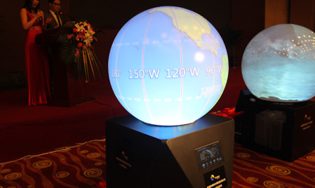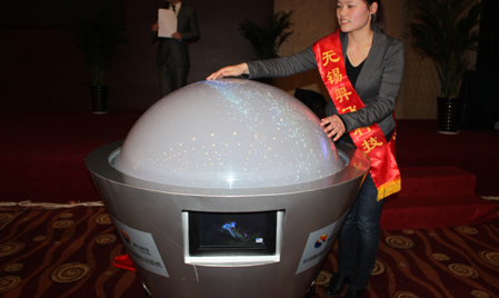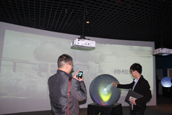 宜興科技局局長潘泉華和羿飛科技的副總經理張文清共同揭曉二號新品是數字星球,這是羿飛科技第一款DLP球形顯示,全球首創內置PC,全觸摸操作設置,在硬件方面已經全面超越了競爭對手。