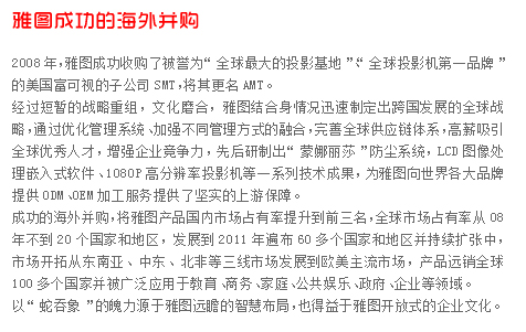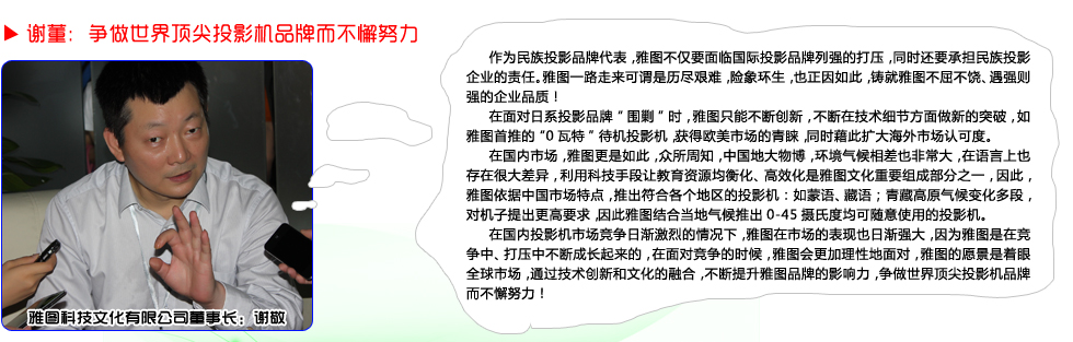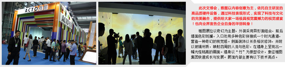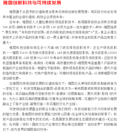 | 關于acto 深圳雅圖文化科技集團是一家集投影技術研發、高端制造和新媒體文化創意、數字科技、連鎖院線于一體的文化科技集團公司,公司創立于1998年5月,是全球領先的微顯示投影技術研發、高端制造和系統集成方案提供商,也是目前全球唯一一家同時擁有DLP、LCD和LCoS三項技術的研發和制造能力的企業。雅圖在投影機、背投電視以及商用平板電視、大屏幕超短焦激光投影電視等領域都確立了技術和制造的領先地位。同時,通過旗下雅圖品牌的成功運營和兼并國際品牌,建立了穩固的全球銷售和服務網絡,產品在全球100多個國家被廣泛應用于教育、商務、家庭、公共娛樂、政府、企業等領域。 10多年來,雅圖集團在文化建設、技術創新、知識產權、市場消費、行業成就、綜合品牌6個領域都碩果累累,取得國家級資質和榮譽100多項。目前在全國已經擁有4家分公司、20多個辦事處以及700多個經銷商。 深圳雅圖集團的管理、研發和文化創意團隊,特點是國際化、高學歷,并兼備國內外著名企業高管經驗,從而實現了企業不斷創新,不斷提升國際競爭力的能力。 企業目前擁有員工近千人,其中主力研發人員占30%。本科以上學歷占比70%,碩士以上15%,整體特點是知識密集型企業。 雅圖擁有國際頂尖的研發團隊,核心技術和行業地位令國外同行震驚和敬畏。截止2011年10月份,雅圖共擁有專利技術120多項,其中100多項是全球一流的關鍵技術發明專利,研發能力處于世界前列。2012年,雅圖品牌和市場份額排名全球第六,成為國內唯一與世界五百強企業平等競爭,并不斷超越的投影企業。 集團創始人、董事長兼總裁謝敬,先后被評為中國和諧社會杰出企業家、全國經濟十大風云人物、中國信息產業年度經濟人物、廣東十大創新人物和廣東省優秀企業家。 從漢朝的中國皮影到中國民族產業的第一投影,雅圖將創意、科技、文化相融合,希望將中國的光影技術傳遞到世界各國,期望用最美的光與影來驅散人們生活中的平淡。 -------------------------------------------------------------------------------- 聯系acto 深圳雅圖數字視頻技術有限公司總部 公司名稱:深圳雅圖數字視頻技術有限公司 公司網址:Http://www.actochina.com 總機電話:+86-0755-86168897 公司傳真:+86-0755-86168895 400電話:400-700-4666 售后Email:ACTO_CSG@actochina.com 公司地址:深圳市高新區科技中二路軟件園7棟三樓 |