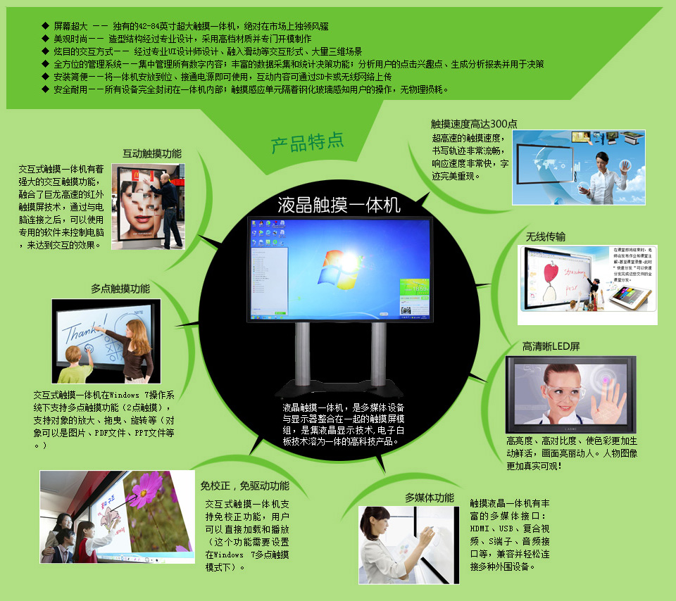 交互觸摸一體機(jī)產(chǎn)品的上市打破了傳統(tǒng)電子白板的競(jìng)爭(zhēng)格局?v觀2013年上半年,在諸多一線城市,比如北京、廣州、上海、南京等地已有相當(dāng)一部分學(xué)校配備電子白板,備受歡迎。但是在應(yīng)用過(guò)程中傳統(tǒng)電子平板作為實(shí)體白板,在技術(shù)上無(wú)法嵌入到投影機(jī)中,而且具有移動(dòng)不便,維修、安裝上的缺點(diǎn),為用戶增加了不少的成本負(fù)擔(dān)。而平板觸摸一體機(jī)產(chǎn)品則能很好解決這些問(wèn)題,也在近幾年成為各大廠家競(jìng)相開(kāi)發(fā)的新型產(chǎn)品。隨著更多觸摸一體機(jī)應(yīng)用需求的加強(qiáng),更多的電子白板廠商開(kāi)始邁向更高層次的發(fā)展。