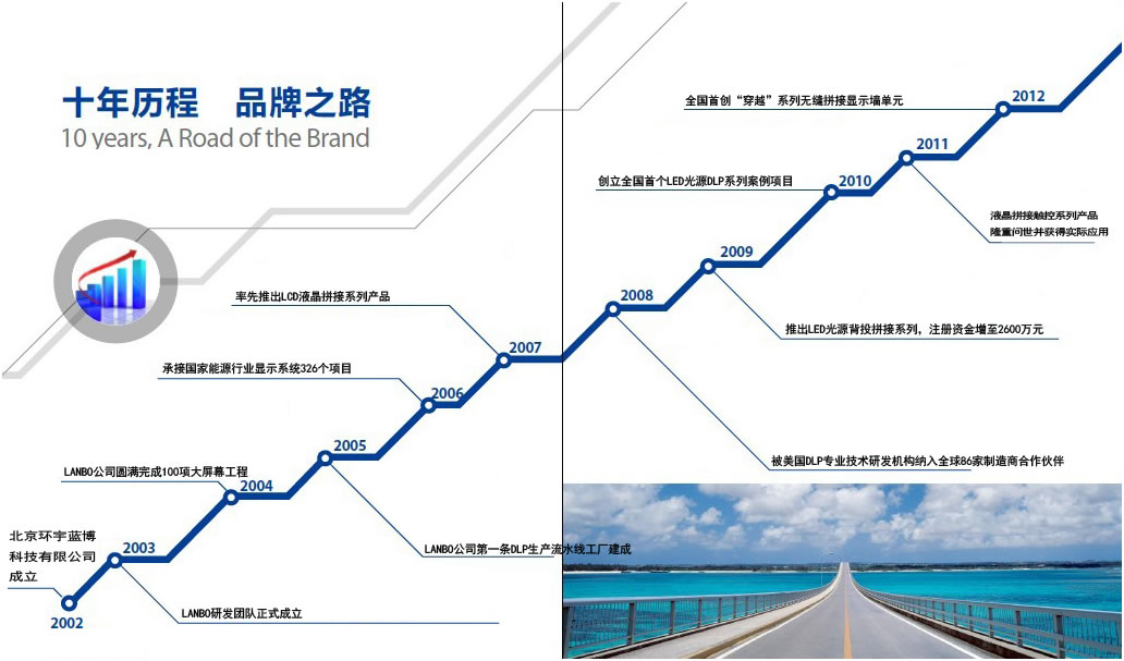 公司擁有雄厚的技術實力、豐富的工程經驗、高素質的經營管理隊伍及專業的技術人才。經過多年的發展,憑借專業的服務精神及優質的售后服務,環宇藍博科技有限公司已在眾多大屏幕公司中脫穎而出,成功樹立了“LANBO”優質品牌,包括:DLP、CRT、LCD、背投影拼接屏幕電視墻及拼接控制器,LED電子顯示屏及控制系統。產品技術先進,品種齊全,幾乎涵蓋大屏幕領域的所有產品。
