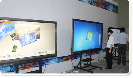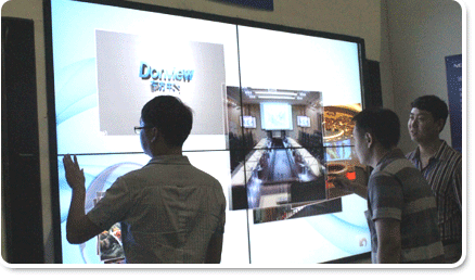 一進場館展示的是東方中原自主研發(fā)液晶拼接屏打造的屏體沙盤,其中,包括一套采用16塊46寸的窄邊拼接屏,整個屏體沙盤系統(tǒng)的建設涉及虛擬仿真技術、邊緣融合技術、立體投影技術、GIS系統(tǒng)等多種技術。互動案例墻采用東方中原4塊55寸液晶拼接屏,分辨率1920X1080,雙邊5.3mm,亮度500cd/㎡,可視角178度。可實現(xiàn)大畫面整體一致性的的展示,同時配備多屏處理系統(tǒng)和紅外觸摸系統(tǒng),充分展示我公司圖片與視頻的成功案例。紅外觸摸系統(tǒng):實現(xiàn)多點、多人互動,任意拖拽、旋轉、放大、縮小。多屏處理系統(tǒng):實現(xiàn)單屏、雙屏、多屏、四屏局部、整體、過渡、流暢的畫面播放。 |