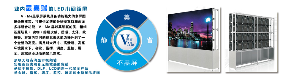 聯(lián)建光電:領(lǐng)航LED小間距 ——替代傳統(tǒng)DLP,首選聯(lián)建V·Me屏 | 在看“圖”說(shuō)話時(shí)代,LED以畫(huà)面無(wú)縫、色彩靚麗已經(jīng)成為DLP、投影、霓虹燈等在大尺寸顯示應(yīng)用領(lǐng)域的絕對(duì)替代品,但眾所周知常規(guī)的LED屏在近距離觀看下難以達(dá)到高質(zhì)量的視覺(jué)效果,即便可行其投資成本也讓買(mǎi)家望而止步。 大屏制造商的領(lǐng)航者---聯(lián)建光電率先推出V?me顯示技術(shù)并成功地實(shí)現(xiàn)產(chǎn)業(yè)化,突破常規(guī)LED近距離(如≤2米)觀看的顯示瓶頸,以?xún)?yōu)于DLP、投影的強(qiáng)烈視覺(jué)沖擊力,和領(lǐng)先...>>詳情 |