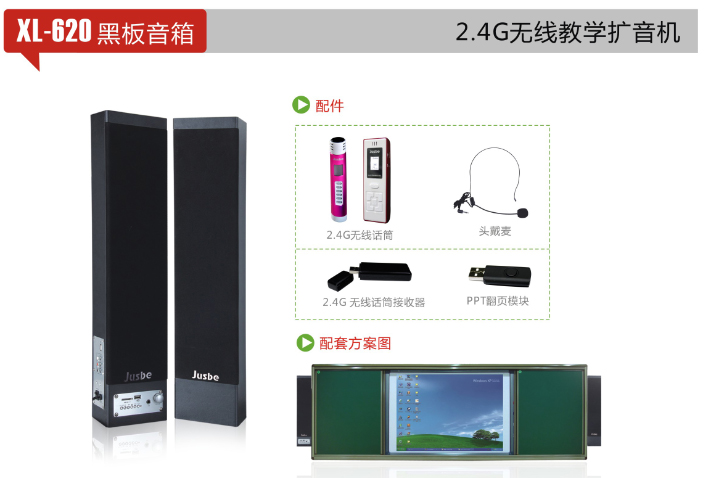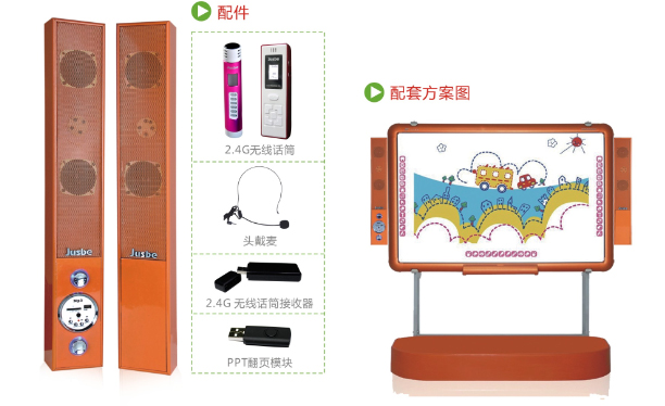 專為幼教電子白板而設計,具有安裝方便,便于攜帶的特點: 一路話筒輸入(環保麥克風插口自帶DC+6V電源); MP3播放功能,支持高速USB2.0、SD/MMC/XD/MS卡等介質,可實現軟件升級; 一路專用USB話筒接口,采用USB接口支持2.4G話筒連接,隨時可擴展實現2.4G話筒使用; 標配安裝配件,安裝簡單方便;